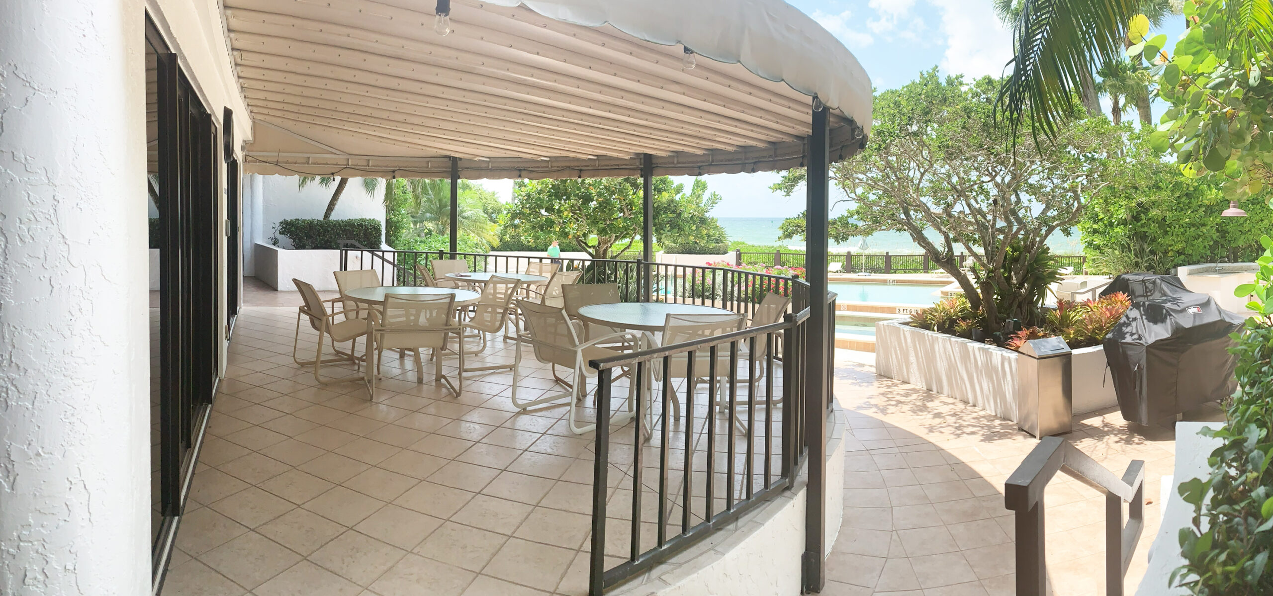 The open concept design includes soft seating, dining tables, and countertop areas supported by a pantry, kitchenette and restrooms for hospitality entertainment. An operable window wall separates the interior space from the new pool deck, allowing for a panoramic indoor-outdoor, open-air experience with direct access to the new pool, spa amenities, outdoor grill stations, and breathtaking views of the Gulf.