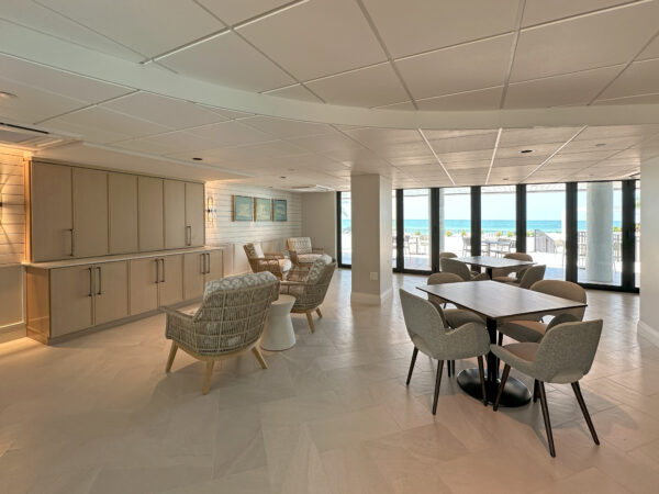 The open concept design includes soft seating, dining tables, and countertop areas supported by a pantry, kitchenette and restrooms for hospitality entertainment. An operable window wall separates the interior space from the new pool deck, allowing for a panoramic indoor-outdoor, open-air experience with direct access to the new pool, spa amenities, outdoor grill stations, and breathtaking views of the Gulf.